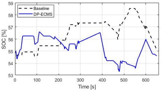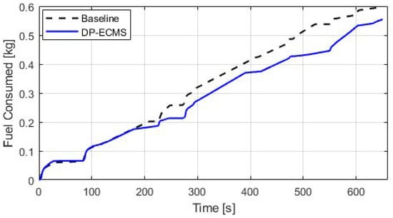 Figure 10 compares the fuel consumption for the two systems. DP-ECMS achieves a 7.1% reduction in fuel consumed compared to the baseline. The use of DP over the full route, assuming prior knowledge of the vehicle instantaneous speed for the entire trip, provides an ideal fuel consumption. When compared to this DP solution (0.53 kg total fuel consumed), the baseline consumes 13% more fuel than DP (0.59 kg total fuel) and the proposed method uses 5% more fuel (0.56 kg total fuel) than DP. It is also shown in Figure 11 that both strategies are approximately charge-sustaining, and the corresponding adapted EFs are shown in Figure 12. Although tailpipe emissions are not directly considered in the objective function, reducing the number of traffic light stops provides the added benefit of emissions reduction [34]. Therefore, it is expected that the proposed EMS will reduce emissions along with fuel consumption. A direct way of addressing tailpipe emissions is to incorporate the emissions in the cost function and after-treatment system dynamics in the dynamic constraints [35].