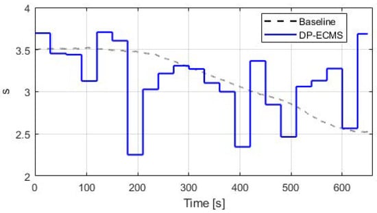 Figure 8 shows the speed profiles for both DP-ECMS and the baseline for one trip. When the vehicle is approaching an intersection during its red phase, the baseline driver initiates the stop sequence in anticipation of the red light. Since it has no knowledge of the signal timing, there is no way to determine if the light will turn green before the vehicle reaches the intersection. DP-ECMS is able to use available look-ahead data to calculate the appropriate speed to arrive at the light on green and adjusts accordingly. For all simulations, the DSRC range is assumed to be 500 m based on studies found in the literature [11,32,33]. Figure 9 shows the travel time versus the distance traveled. DP-ECMS slows the vehicle down just enough to pass through the green window when possible, while the baseline will always initiate a stop if the light is red. The travel time is approximately equal for both methods.