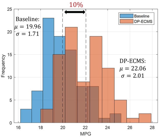 A Monte Carlo analysis is conducted with a sample size of 85, where the random variables are SPaT and average traffic speed. Both the baseline and DP-ECMS are run using the same traffic and SPaT patterns to ensure that the results are directly comparable. Considering that the vehicle in question has an electrified powertrain, it is important to keep track of the battery SOC. A common way to account for differences in the final and initial SOC is to apply a correction factor to fuel consumption based on the magnitude of the deviation [36]. However, this process can be imprecise and is difficult to properly apply to a large number of samples. To simplify the process, each trip was repeated 10 times and the FE (MPG) was computed for the duration of the 10 cycles. By doing so, the small deviations in the SOC are negligible over the energy consumed by burning fuel over 10 trips. Figure 13 shows the Monte Carlo simulation results with overlaid histograms for both DP-ECMS and the baseline along with the mean and standard deviation.