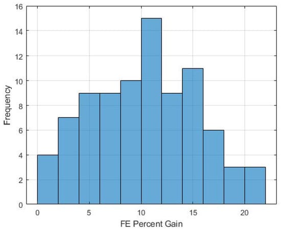 The DP-ECMS method yields MPG values which range from about 18 to 28 MPG, while the baseline ranges from 16.1 to 25 MPG. The median bin for the baseline is 18.2 to 19.2 MPG, whereas for DP-ECMS, it is 20.2 to 21.3 MPG. DP-ECMS yields an average FE of 22.06 MPG, while the baseline is 19.96 MPG. The results show that, on average, the DP-ECMS provided a 10% FE increase over baseline. A histogram of the percent gain in FE is shown in Figure 14, which shows gains in FE for each trip.