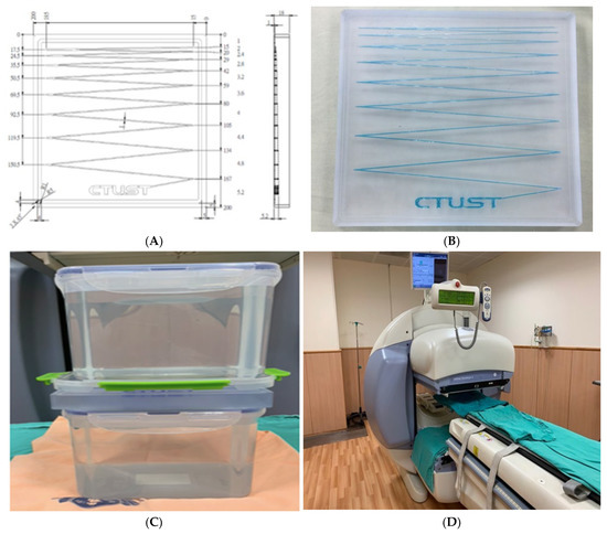 (A) the precise designation chart of this unique PMMA V-shaped slit gauge (200 × 200 × 18 mm3). The slit width is designed as fixed 1.0 mm along the pathway. (B) A 7.4 MBq Tc-99m radioactive solution is diluted to 11 c.c. and dyed with blue ink for easier identification inside the gauge. (C) The radioactive V-shaped slit gauge was placed in the middle of two water containers. Each container was filled with 15 cm thick water and mixed with 0.925 MBq Tc-99m for scanning. (D) Gamma camera GE Infinia Hawkeye 4 SPECT/CT used in this study.