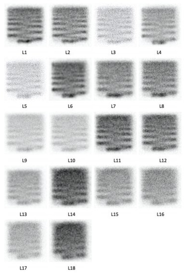Eighteen original scanned images from the gamma camera according to Taguchi’s eighteen factor combinations. The image quality was judged by sharpness, brightness, sensitivity, and contrast ratio altogether.