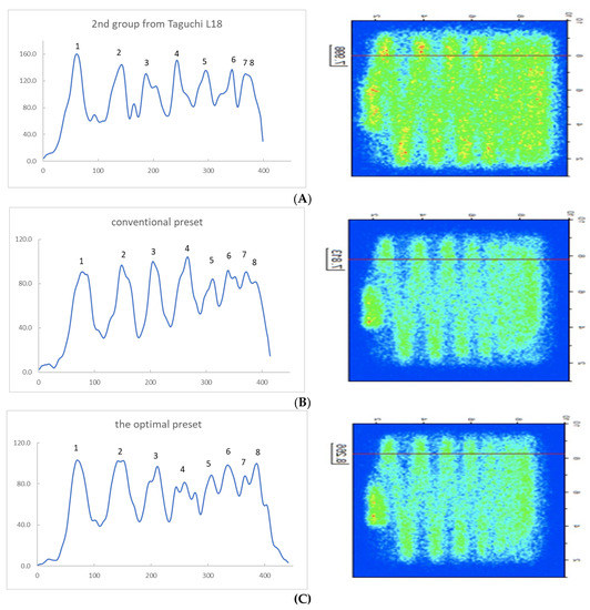 A small MDD is always preferable for the gamma camera scan image due to its superior recognizable capability in diagnosing the spine structure. As seen in Figure 2A, two peaks can be recognized as fully separated; (B) two peaks barely passed the Student’s t-test evaluation; nevertheless, in (C), the two peaks are too close to be distinguished. Note that the principle of failing or passing the Student’s t-test are calculated because they are completely built on the calculation results, comparing to other reports, which are mostly stood on the qualitative discrimination of radiologists and may include human factor-biased uncertainties. Therefore, the quantified MDD can provide an auxiliary tool in justifying the performing of gamma camera scanned imaging rather than radiologists’ visual ranking. However, manual judgment is still essential in the preliminary sorting stage of the Taguchi analysis.