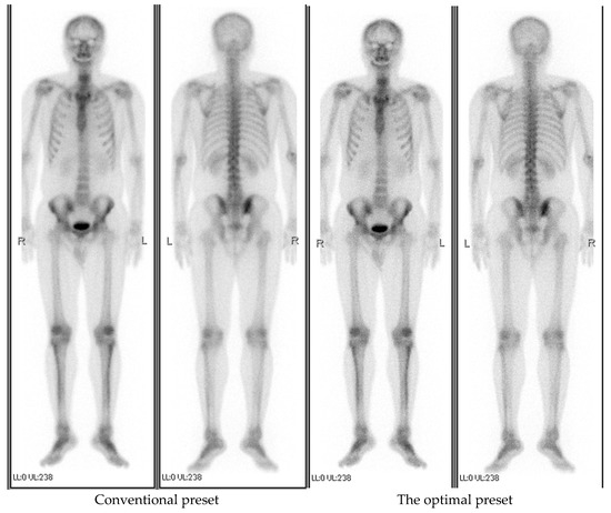 To further testify the optimal preset of the gamma camera, the scanned image was compared to the conventional preset, as shown in Figure 7. As clearly depicted, the optimal preset yielded clearer images with greater contrast than did the conventional preset. Specifically, the shadow of the ribs and pelvis could be identified, and the sacroiliac joint could also be delineated from the optimal figure. The clinical procedures had been accomplished between June to December 2021 under IRB no. B11002019 approved by the Buddhist Dalin Tuzchi Hospital. The optimization of the imaging system improved the gamma camera images for better clinical examination.