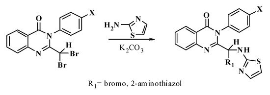 Quinazolinone derivatives, 2-aminothiazol, and potassium carbonate were added into a two-neck flask containing ethanol. Then, the mixture was stirred and refluxed. The reaction was checked by TLC.