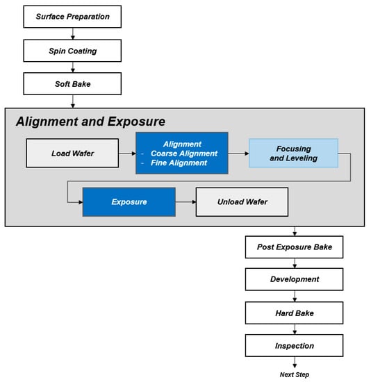 The alignment process proceeds as follows: Extract the feature value of the mark before performing mark recognition and alignment. Analyze the geometric shape of the mark, extract the pixels obtained from the pattern, and find the pattern matching within the area. Then, check the markings on both sides of the Mask Alignment (MA) and check whether the alignment of the mask is well achieved through this marking. Next is Global Alignment. Check that both sides of the wafer are marked, and check whether the alignment of the wafer is correct throughout this marking. Finally, Fine Alignment checks whether the print and the reticle are the same. After the mask is properly aligned with the wafer, patterning should be performed sequentially. For this confirmation, various marks exist on the wafer. Photolithography performance factors include resolution, depth of field, field of view indicating viewing angle, modulated transfer function, spatial coherence, alignment accuracy, and throughput factors for semiconductor production yield [20]. There is no tolerance in the exact position when each layer of the wafer is stacked. The measure of the value stacked vertically is called the overlay, and it refers to the alignment state of each layer. Precise alignment technology can increase the overlay value; otherwise, misalign problems will occur. Thermal run-out error, translational error, and rotation error are types of overlay errors. If there is misalignment, there is a very high possibility that the device will malfunction or an electrical defect will occur, resulting in a loss.