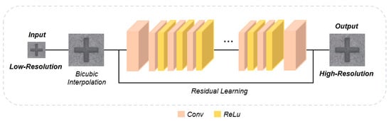 Using a deep learning model to design a deep network increases the amount of computation and the number of parameters. However, when learning a deep network, gradient-vanishing or gradient-exploding problems may occur in the backpropagation process toward the input layer, and filter parameters may not be properly learned. Therefore, even if the network is designed deeply, the performance of the network does not increase proportionally. To solve this problem, He et al. [29] proposed ResNet, which is a network that can improve performance without problems, even in deep networks. Residual learning is a method of adding the input LR image to the final output HR image and learning the difference value between the two images. In general, since the input LR image and the output HR image are similar, the difference value is very small, so the problems of gradient vanishing and gradient exploding can be solved. Figure 4 shows the VDSR structure with a relatively deep 20-layer network (at the time the paper was published) through residual learning. VDSR also uses input LR images and output HR images upscaled by bicubic interpolation for network training. The difference between the input LR image and the output HR image is input to the network, and the input LR image is added at the last output stage. This method can simplify computation and can be easily optimized for deep networks. After this, several networks have used this residual learning to design deeper networks. Lim et al. [30] proposed EDSR, which is a deep and wide network that improves high performance. EDSR uses more than 32 layers, and the number of channels has been increased by more than four times that of other existing networks, thus increasing the number of parameters.