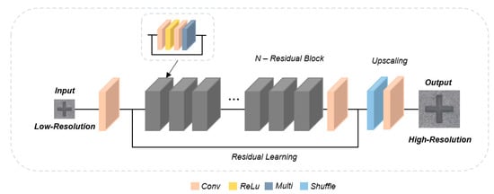 - Shi, W.; Caballero, J.; Huszár, F.; Totz, J.; Aitken, A.P.; Bishop, R.; Rueckert, D.; Wang, Z. Real-time single image and video super-resolution using an efficient sub-pixel convolutional neural network. In Proceedings of the IEEE Conference on Computer Vision and Pattern Recognition, Las Vegas, NV, USA, 27–30 June 2016; pp. 1874–1883. [Google Scholar]