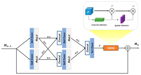 Through two-scale convolution filters, multiple bypass networks are used to find image features at different scales. Figure 7 shows the structure of the Multiscale Residual Attention Block. In the existing multiscale feature extraction module, different channels and different location information in space are provided. The feature map generated at each step is connected to the CBAM module through multiple M blocks. Through this, by combining the location information and context information of various layers, important information in the image can be conveyed well, and an accurate prediction is obtained by obtaining a clear image.