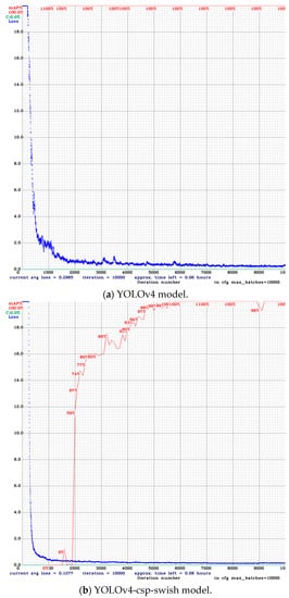 The prediction performance is calculated by a loss function that classifies the input data points in the data set. The smaller the loss value, the better the classifier models the relationship between the input data and the output target. The gradual decrease in loss values after each epoch shown in Figure 10 represents the gradual learning process of YOLOv4, YOLO-csp-swish, and YOLOv4-tiny. The curves obtained by the loss functions of YOLOv4, YOLO-csp-swish, and YOLOv4-tiny are very stable after 2000 epochs.