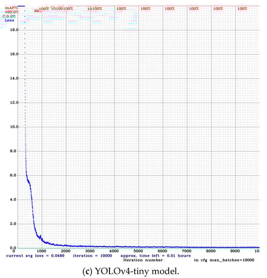 In deep learning, data augmentation can solve the imbalance problem, and it is used in various experiments. Data augmentation is used to prevent overfitting problems and increase performance by increasing the number of data, and various studies have been conducted on this topic. In this experiment, the data object alignment mark was standardized, and the learning results of the three models YOLOv4, YOLOv4-csp-swish, and YOLOv4-tiny showed sufficiently high accuracy; therefore, the data augmentation technique was not applied in this experiment. The hyperparameters related to learning are as follows: The model was supplied with a (width, height, channel) image input. The batch size was set at 32 subdivisions. The learning rate value was set at 0.0013. The maximum batch size was set as the standard formula for using YOLO Darknet Version 4. The maximum batch value was set to 10,000, reducing the learning rate by 1/10 at 7000 and 8000. The training was conducted with models of YOLOv4, YOLO-csp-swish, and YOLOv4-tiny. During training, we used pre-trained weight models and appropriate convolutional layer filters for YOLOv4, YOLO-csp-swish, and YOLOv4-tiny. Loss and mAP (50%) values were obtained after each iteration, and the training process was stable, as all three models had an average success value of 100% at mAP_0.5. Figure 10 shows a summary of the training process for each model.