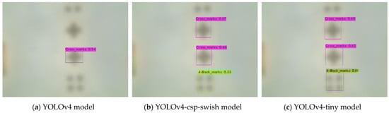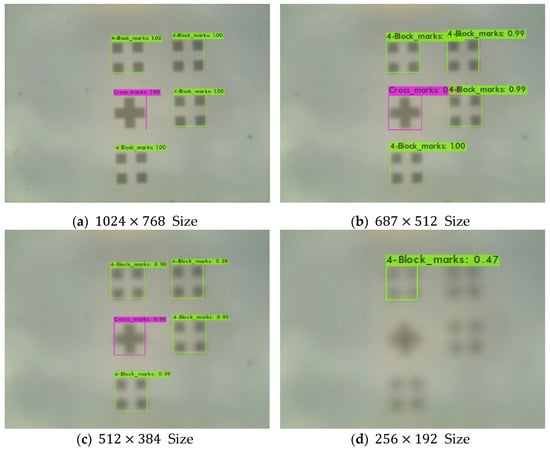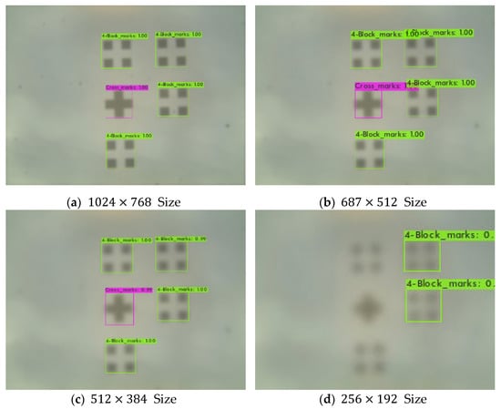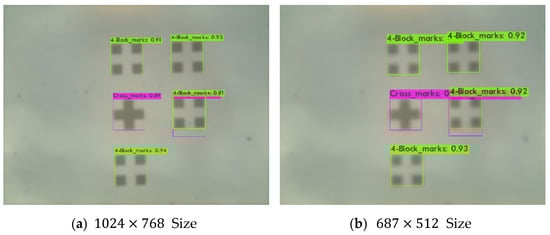 As a result of the test, YOLOv4 performed better than the YOLOv4-csp-swish and YOLOv4-tiny models. Overall, all models detected the alignment marks more thoroughly without omission and with large reliability values. However, during the experiment, there was a decrease in the detection accuracy of the alignment mark depending on the resolution of the camera, and improvement was needed. As shown in Table 3, the performance results of the size and size are clearly different. In particular, the alignment detection performance of the image was poor. Overall Precision, Recall, F1-Score, IOU, and mAp values were significantly lower than other sizes of data. Therefore, an experiment was conducted to improve the image resolution of the size.