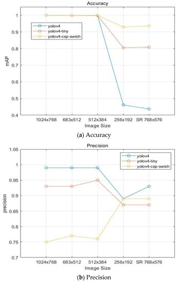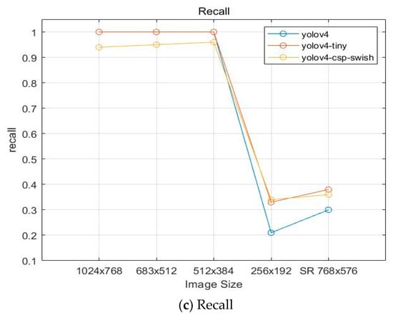 Figure 15 is a graph of the results of accuracy, precision, and recall for the entire image. First, the accuracy was excellent when the size was , , and . However, when it was , the accuracy was significantly reduced. In size to which our proposed model is applied, the accuracy is slightly improved in the YOLOv4-csp-swish and YOLOv4-tiny models compared to . Precision was improved when we used the YOLOv4 model based on size . In addition, the reproducibility was excellent when the recall was , , and size. However, in size , the reproducibility was significantly lowered. The recall increased by applying the SR image for our proposed model. In the case of low quality due to the low image resolution, this model was applied to enlarge the image size and to produce the effective results of super resolution. In addition, it was found through the experiment that the size of the image influenced the resolution and object detection. As shown in Figure 15, accuracy, precision, and recall results slightly increased overall. Although some performance results have yet to be obtained, the model proposed through this experiment is expected to be applicable to actual industries. In the experiment, the model was applied to low-quality data to assume unfavorable data in the manufacturing industry, and improvements were made. In other words, it was confirmed that low-quality data were improved, and in the case of normal-quality data, it is expected that there will be sufficient improvement.