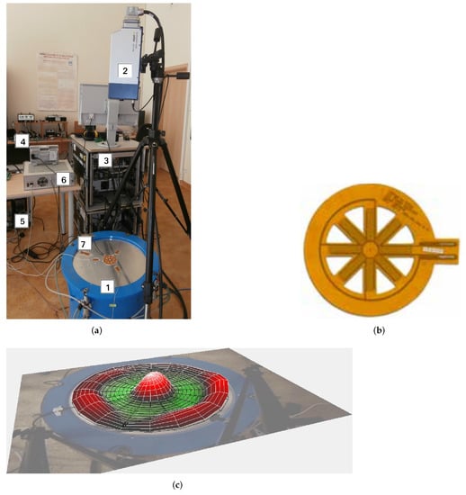 The MFC element used as an actuator is made of eight rectangular elements connected in a star shape, each of which works in higher elongations (2000 ppm) mode with a supply voltage in the range of 500–1500 V. The actuator is made as a monolithic element with a diameter of 40 mm. The actuator used is shown in Figure 1a. Its parameters was shown on Table 2.