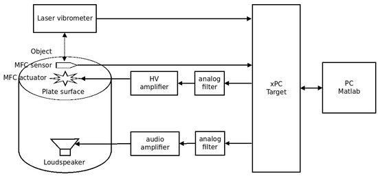 The test stand was built using a real-time control and measurement system working with the Matlab XPC Target software. The inputs of the measuring system card (PD2-MFS-8-500/14) were connected directly to MFC sensors (M-2807-P1) and the output of the laser vibrometer. The outputs of the D/A converter card (PD2-AO-8/16) were connected via an analog low-pass filter and amplifiers to actuators (speaker and star MFC). An analog filter was designed based on the Butterworth method and its cut-off frequency was 1 kHz. An analog filter was used to reproduce the output signal due to the low sampling frequency of the RT system (5 kHz). The voltage value on the actuator is related to the ranges of voltage signals generated by the DAC card (−5 V, +5 V). The structure of the implemented control system is presented in Figure 3.