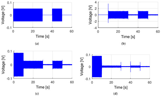 It can be seen (Figure 4b) that the control signal started with a delay −10 s after the excitation signal (Figure 4a) and vibration amplitude remained almost constant for 20 s of the test when the excitation force was stopped for 10 s. If the plate was not forced to vibrate, for example, between 30–40 s, and 50–60 s, the adaptive controller produced a signal with a small, almost constant amplitude. From Figure 4c, it can be stated that plate vibrations are damped very well—the vibration amplitude of plate response in the range of 10–30 s (and also 40–50 s) decreased by more than 50%. Figure 4d shows the plate response for the same input as above, but instead of controller1, the 6th order controller 2, is turned on in the control system. This controller calculates the control signal based on a more accurate object model (nA = 6). As can be seen, a very high, about 90%, vibration reduction value was obtained in this case. This example shows that the effectiveness of adaptive feedback control increases with the increase in the accuracy of the model ( which was to be expected), moreover, it can be seen that adaptive feedback control is very effective even when the model order is not too high (nA = 6).
