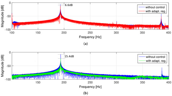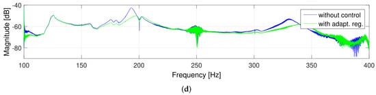 Figure 5 shows the results of the frequency analysis for the 0.1 Vpp excitation amplitude. In the case of excitation with a frequency corresponding to the object resonant frequency 193 Hz, one can see the exact vibration reduction performance of the controllers in [dB]. As can be seen from Figure 5a, controller 1 reduces the plate response amplitude by 8 dB, and controler 2—by 15 dB (Figure 5b).