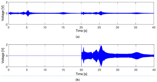 Time response of the system for a chirp excitation without control (0–20 s) and with the adaptive controller No.1 (20–40 s). (a) Plate response; (b) Control signal.