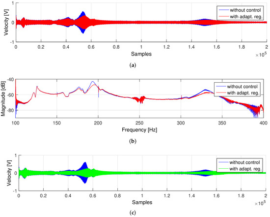 In order to compare the obtained time waveforms more precisely, they were superimposed so that the amplitude values corresponded to the same frequencies of the disturbing signal (Figure 7), and also a FFT (Fast Fourier Transform) analysis was performed. The graph shows that two version of the considered controllers can suppress three resonant frequencies of the plate in the range from 100 Hz to 400 Hz.