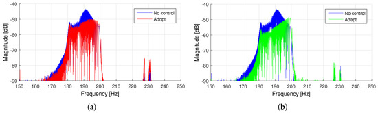 FFT plate responses to the chirp excitation of 150–200 Hz without control (blue plot) and with the adaptive controller (green and red plot). (a) Controller 1; (b) Controller 2.