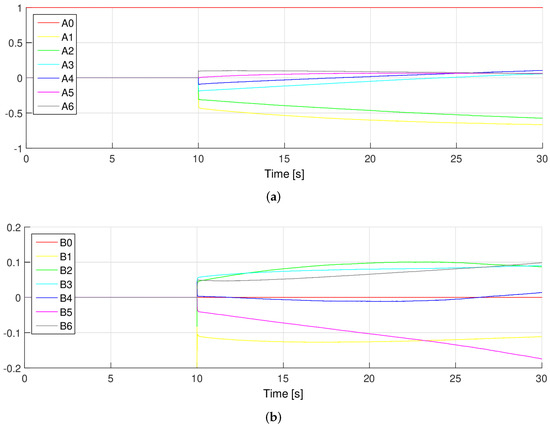 Figure 9 presents how the recursively calculated parameters of the object model change in time, in response to the chirp-type excitation. As above, the colors in the chart correspond to the coefficients of the and polynomials.