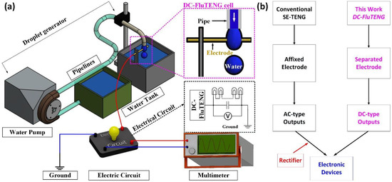 Based on the representative component layers of a conventional single-electrode-based TENG, the charge-generating layer and charge-collecting layer (electrode) are normally affixed together. However, in the case of DC–FluTENG, the electrode is completely separated from the charge-generating layer (pipe), which indicates an improved single-electrode configuration. It leads to the difference in output characteristics of the DC–FluTENG and conventional SE-TENGs. Conventional SE–TENGs normally come out with alternating current outputs, and then a rectifier module is needed to convert the AC output into DC output before powering electronic devices. Meanwhile, DC–FluTENG exhibits direct-current outputs that can power directly electronic devices without requiring a rectifier. This is an advance in comparison with conventional SE–TENGs, as shown in Figure 1b.