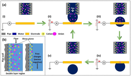 The fundamental theory of a liquid–solid TENG relates to the formation of the electrical double layer (EDL), consisting of an inner layer (or Stern layer) and a diffuse layer, at the liquid–solid contact interfaces. When water comes into contact with a solid surface, the ions existing in the water, such as H3O+, OH−, and other positive/negative ions, form an electrical double layer. According to the “two-step” model proposed by Wang et al. [2], the origin of forming EDL was demonstrated as the result of CE in the first step, due to the electron transfer occurring when the molecules/atoms inside the water interact directly with the atoms on the solid surface. We can assume that charges in the Stern layer are close to the solid surface, which can only move along the surface. Meanwhile, the movement of charges in the diffuse layer is not restricted to the surface. These charges can separate from the EDL and move along with the water flow. At a static state, the ions can distribute themselves in EDL, in which the concentration of the counter-ions is high near the wall and decreases dramatically away from the wall. When the water flow is applied, the diffuse layer in EDL is dragged downstream and temporarily replaced by neutral liquid. As the charges on the solid surface are immobile, the movement of ions in EDL will cause an accumulation of charges downstream and the deficit of counter-ions upstream. In this instant, counter-ions will be drawn back; meanwhile, co-ions from the EDL and liquid bulk will be pushed away by the charges on the solid surface and the accumulated charges downstream in an attempt to recover the initial EDL structure [39,40,41,42]. In other words, the diffuse layer is shrunk due to part of the diffuse layer being washed away by the flowing water. Thus, the flowing water carries part of the electric charge of the double layer and generates free electrostatic charges (excess negative), as presented in Figure 2b. The charge carried by water droplets dispensed from a capillary is studied by J. Nauruzbayeva et al. [39], which demonstrated that the droplets exposed from a water-filled capillary could carry excess negative charges.