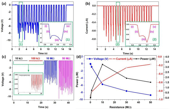 To evaluate the electrical characteristics of the DC–FluTENG, DI water droplets (about 1.06 mL) are delivered periodically into the system at a flow rate of 113 mL/min. Here, the aluminum electrode is used. Due to the continuous flow of water droplets, a stable open-circuit voltage (Voc) and short-circuit current (Isc) are continuously generated, as shown in Figure 3a,b. As regards these figures, both voltage and current signals are obtained as the distinct characteristics of pulsed direct current. It can be observed that, with a single droplet, DC–FluTENG can produce an average Voc of −8.1 V and an average Isc of −0.757 µA, corresponding to a maximum charge transfer of 78 nC (calculated in short-circuit mode). Herein, the negative sign (−) represents the direction of the electric current according to the electrical measurement setup, that is, from the ground to the electrode. The inset images present the correspondence between typical pulses of Voc and Isc and the step-by-step process mentioned in the above section. Obviously, the pulse outputs are observed when water and the electrode are in contact, in which the signal exhibits a large acceleration from zero and deceleration to zero at the beginning and the end of the contact-separation process, respectively; during the contact, the output signal fluctuates around an average value; otherwise, no electrical signal is produced in the whole circuit.