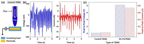 In regard to another aspect, to verify that the DC outputs are generated due to the direct contact of water with the electrode, comparison experiments were conducted by covering the electrode with an insulating layer, such as polyvinyl chloride, resulting in a control single-electrode-based TENG, as shown in Figure 4a. The performance of this control-TENG was studied, and the results are shown in Figure 4b. It can be seen that both Voc and Isc are obtained AC electrical characteristics with amplitudes of about 100 mV and 11 nA, respectively. In comparison with the system shown in Figure 1, the only change made is the insulation on the electrode. It can be concluded that the DC electric pulses are generated due to the advanced electrode configuration. Notably, the peak-to-peak Voc and Isc of DC–FluTENG are approximately 40 times and 28 times higher than those of the control-TENG, which declares a great enhancement in the output performance of DC–FluTENG, as presented in Figure 4c.