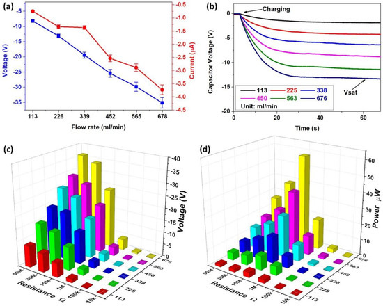 More interestingly, generated electric energy can directly charge an energy storage unit without requiring a rectifier unit. The charging capability concerning the flow rate is studied by measuring the voltage developed across a 1 µF capacitor in the external circuit. The charging behaviors are plotted in Figure 5b, where the maximum measured voltage is obtained at a flow rate of 676 mL/min with a value of about −13.3 V, corresponding to a maximum amount of 88.45 µJ energy stored. Additionally, the impact of the water-flow rate on the output performance is also investigated by applying various load resistance in the external circuit with a range from 10 kΩ to 50 MΩ. The average voltage and instantaneous power are respectively represented in Figure 5c,d. At the same load resistance, the magnitudes of both the peak voltage and maximum instantaneous power are monotonically increasing with the flow rate. Meanwhile, for each applied flow rate, the highest values of power output are found at the optimal loading resistance of 10 MΩ. Consequently, the highest output power obtains a value of 57.6 µW regarding the power density of 5.76 W/m2, as measured at the load resistance of 10 MΩ under a flow rate of 676 mL/min.