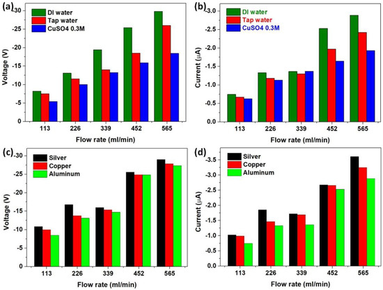 In the same manner, silver, copper, and aluminum were selected as the material of the electrode to examine the output performance of the device. The output Voc and Isc are illustrated in Supplementary Materials Figure S2c,d; here, DI water was used as the test water. It can be seen that the silver electrode can produce a higher output voltage and current than those produced by other metal electrodes. There is a slight difference of about 10% in the average magnitude of Voc and Isc between silver and copper electrodes, whilst the output of the aluminum electrode is only about 75% of that generated by the silver electrode. Thus, the silver electrode can generate a higher output than copper and aluminum can. This arrangement in output performance could relate to the conductivity of these metals, in which silver is the best conductor. On another hand, the experimental data shown in Figure 6c,d declare the rising trend of the magnitude of the output signals with the increase of water-flow rate.