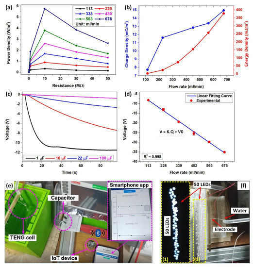 Moreover, the ability to generate DC output enables the TENG to directly drive electronic devices. DC–FluTENG is integrated into a self-powered IoT sensors device and acts as a power source, as described in Supplementary Materials Figure S3a. DC power generated by the TENG can be used to directly charge an energy storage unit, such as a capacitor, without requiring a rectifier. The actual experiments are demonstrated in Supplementary Materials Figure S3b and Video S1. The charging behaviors plotted in Figure 7c were examined by using different capacitors from 1 to 100 µF. It can be observed that larger capacitances have to take more time to achieve the saturation voltage. Under a droplet flow rate of 113 mL/min, to attain a voltage of about 2 V, a 100 µF capacitor needs more than 270 s, while a 10 µF capacitor can reach 2 V within 20 s. However, at the same period, a 1 µF capacitor can be charged to 10 V. This is important to find out the optimal load capacitance in achieving the maximum energy storage. To demonstrate the application of the device as a power source in IoT sensing systems, a commercial Internet of Things (IoT) device, namely Solar-Powered BLE Beacon of Cypress Semiconductor Corporation company, is used. This IoT device could be powered by DC–FluTENG instead of the solar part which is removed. The room temperature and humidity signals are transmitted to the smartphone via Bluetooth after charging in the capacitor within 20 s; here, a 1 µF capacitor was utilized. The actual experimental operation is shown in Figure 7e and Supplementary Materials Video S2. In addition, DC–FluTENG not only can charge the energy storage unit directly but also power electronics directly. In this work, light-emitting diodes (LEDs) can be utilized to verify the application of the TENG. As shown in the inset image of Figure 7f, 50 LEDs in series can be illuminated by connecting directly with the DC–FluTENG without a rectifier, thus indicating another advantage of the TENG in practical applications. It can also be demonstrated in Supplementary Materials Video S3, the actual experimental operation. These results prove that DC–FluTENG can be effectively utilized to directly drive electronics; thus, it shows a high potential application value.