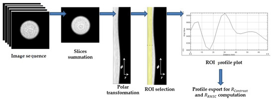 Considering the radial nature of concentric ring artifacts, two more image features were computed: radial contrast () and radial root-mean-square contrast () [17]. Custom macros were written for ImageJ software to compute R and R from the 40 SPECT phantom images [18]. The workflow used to obtain radial features is illustrated in Figure 5. Depending on voxel dimension, 8–10 tomographic homogeneous phantom transaxial sections () were summed together: