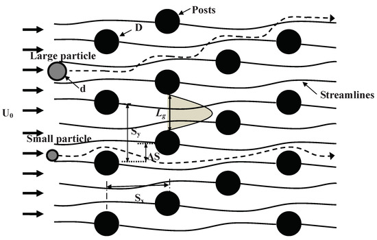 The separation of particles is an important process in the medical laboratories and biomedical industries. Some traditional separation technologies have been developed for centuries, such as filtration, centrifugation, chromatography, and electrophoresis [1]. In recent decades, with the rapid development of micro-electromechanical systems (MEMS), several continuous flow separation methods have been proposed in microfluidic devices. Huang [2] proposed a size-based continuous separation technique, termed as “deterministic lateral displacement” (referred to as DLD). A schematic diagram of the DLD device is shown in Figure 1. The DLD device is mainly composed of an ordered array of obstacles such as cylindrical posts. The array has a fixed lateral shift between the neighboring columns. Small particles are able to largely follow the undisturbed streamlines through the array along a zigzag path (referred to as zigzag mode), whereas large particles travel across the flow lane or the “separation” streamlines which go through the stagnation points of the flow past the posts due to the interaction with the posts, being laterally displaced (referred to as lateral-displacement mode), as shown in Figure 1.