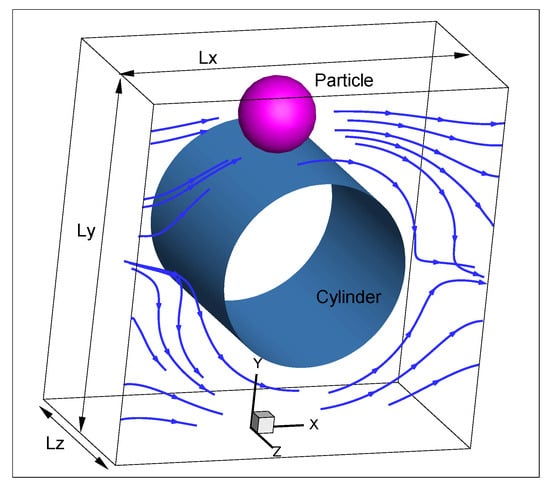 We have developed the direct-forcing fictitious domain (DF/FD) method [29] for the direct numerical simulation of particle-laden flows, based on the modification of the original distributed-Lagrange-multiplier-based FD method of Glowinski [30]. The key idea of the FD method is to fill the interior domain of particles with fictitious fluids, and distribute a pseudo-body force (i.e., distributed Lagrange multiplier) over the solid region to enforce the rigid-body constraints [30]. Our FD method has been applied to the motion mode of a flexible particle in a two-dimensional DLD device [22] and a wide range of particle-laden flows (e.g., [31,32,33,34]). However, it is not possible to apply our FD code to a three-dimensional DLD geometry with a great many number of posts and inlet–outlet boundaries due to huge computational costs. Thus, following Krüger [26] and Henry [27], we adopt a DLD cell with the periodic boundary condition in the lateral (y) direction and a shifted periodic boundary condition in the streamwise (x) direction, as shown in Figure 2. The no-slip wall boundary condition is imposed in the spanwise (z) direction, since we plan to examine the spanwise spatial constraint effect on the motion of the bioparticle in the DLD device [35] in the future. A pressure gradient is imposed in the streamwise direction to maintain a constant fluid mean velocity . The size of the computational domain (i.e., DLD cell) is . The cylinder with the diameter of D is located at the center of the cell. In the present study, we set , and , so that the gap distance between vertical neighboring posts (i.e., in Figure 1) is . For a row shift of , the shifted periodic boundary condition implies that