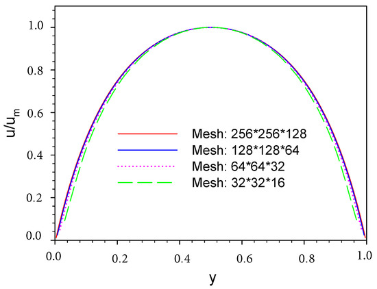 The modification of our previous FD code on the solution of the fluid field is substantial, but there are no data on DLD in literature available for rigorously validating our code. Hence, we perform a mesh convergence test for the solution of the flow in the absence of the particle, which also helps to choose a suitable mesh resolution. The computational domain size is , as mentioned earlier. The profiles of the streamwise velocity normalized with its maximum between vertical neighboring posts for the mesh numbers of , , , and are compared in Figure 3. One can see that the solution with the mesh is in excellent agreement with the one with .
