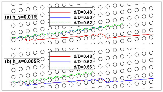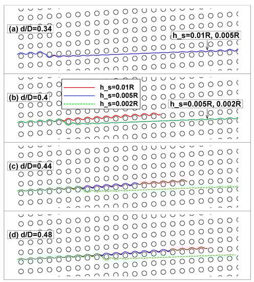 Figure 5 shows the particle trajectories for ,,, and at different till in the DLD with the periodicity of N = 16. We see that the particle of experiences a mode transition from zigzag at to LD at in Figure 5b, and the particles of and experience such transition from to in Figure 5c,d. Therefore, the effect of the lubrication force saturation on the motion mode is significant. The lubrication force serves as a repulsive force when the particle approaches the cylinder and as an attractive force when the particle moves away from the cylinder. From our results, the lubrication force tends to make the particle more prone to the zigzag mode, consistent with the observation that the experimental critical particle diameter is larger than the theoretical prediction (i.e., twice the first flow lane width) [5,10]. As the saturation distance increases, the effect of the lubrication force decreases, resulting in the transition from zigzag to LD, as observed above.