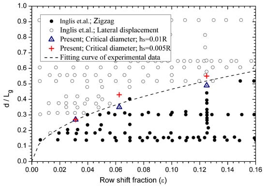For a larger row shift fraction (i.e., smaller periodicity N), the particle critical diameter is larger, and the short-range hydrodynamic interaction between the particle and the cylinder is stronger; thus, generally, we expect a stronger effect of the lubrication force saturation on the particle motion mode, as evidenced by scattered experimental data on the critical diameter at large row shift fractions [5,10]. The effect of the lubrication force saturation due to the surface roughness may be an important reason for the discrepancy between the critical diameters of different groups, as shown in Hochstetter [5].