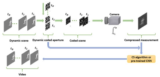 This model is inspired from video CS and is shown in Figure 5. The video is considered to be a dynamic scene that is represented as a sequence of images with different chrono-dating . The coded frames are then integrated over time on a camera forming a measurement compressed to a single image. In accordance with the measurement and coding models, the iterative algorithms or pre-formed neural networks are used to reconstruct the video.