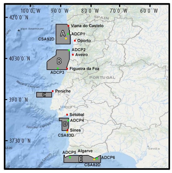 Figure 1. Map of the 5 study areas from the Aquimar project (A—Area A (between Viana do Castelo and Oporto); B—Area B (between Aveiro and Figueira da Foz); C—Area C (Peniche); D—Area D (between Setúbal and Sines); E—Area E (Algarve region); ( main cities near the surveyed areas); Wave buoys stations : CSA92D; CSA83D and CSA82D; Currents stations : ADCP1, ADCP2, ADCP3, ADCP4, ADCP5, and ADCP6).