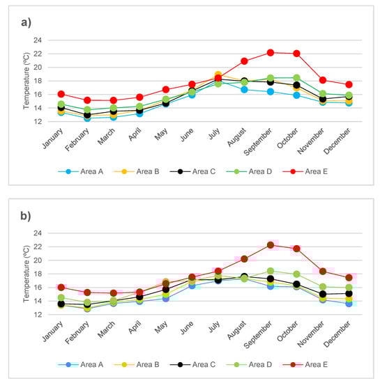 Mean monthly temperature data were collected from the NASA GHRSST (Group for High-Resolution Sea Surface Temperature, Level 4) project platform. This platform collects daily ocean temperature data up to 1 m depth across the globe. It uses AVHRR (Advanced Very High Resolution Radiometer), AMSR-E (Advanced Microwave Scanning Radiometer), GOES (Geostationary Operational Environmental Satellite), and MODIS (Moderate Resolution Imaging Spectroradiometer) systems (Naval Oceanographic Office, GHTSST Level 4, 2008). This platform allows the extraction of oceanographic temperatures every 625 km2 (25 × 25 km). The daily temperature values were used to collect and calculate the monthly mean temperature values in 2018 (Figure 2a) and 2019 (Figure 2b) within the boundaries of each area studied.