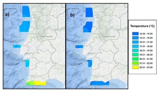 Figure 3. Map of surface temperature (°C) in the 5 study areas of the Portuguese coast in (a) October 2018 and (b) April 2019 surveys.