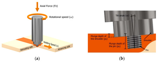 Despite the simplicity of operation, the number of parameters involved that affect the quality of the welds makes the study of the FSW complex. For this reason, it is important to explain what each parameter corresponds to, in order to understand its influence on the process. The main welding parameters involved in the FSW are the rotational speed , welding speed , tilt angle , plunge depth , and axial force .