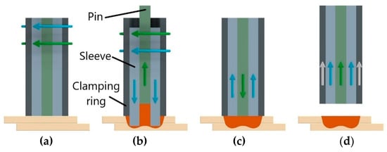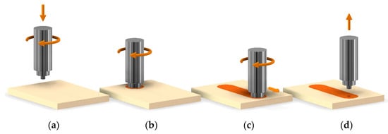 RFSSW with sleeve plunge configuration main steps: (a) initiation stage, (b) sleeve penetration stage, (c) weld seam compression stage and (d) tool retracting stage.