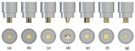 Main pin geometries used in FSW: (a) straight cylindrical, (b) cylindrical threaded, (c) cylindrical grooved, (d) straight conical or tapered, (e) straight hexagonal, (f) straight square, and (g) straight triangular.