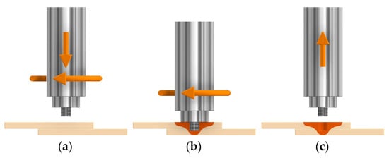 FSSW main steps: (a) plunging stage, (b) stirring stage, and (c) retraction stage.