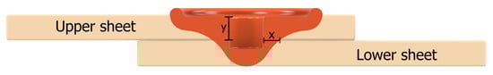From the analysis of the cross section of the weld region, it is possible to identify two geometric characteristics of the weld that make it possible to draw several conclusions about the quality of the FSSW: the thickness of the weld nugget () and the thickness of the upper sheet under the shoulder indentation () [64], both represented in Figure 5. The thickness of the weld nugget () is directly related to the area of the weld cross section (). Therefore, the increase in one means the increase in the other. A larger welded area corresponds to a greater amount of joined material and therefore usually means a stronger joint [64]. The thickness of the upper sheet under the shoulder indentation (), as the name implies, corresponds to the height of the upper plate after the FSSW process. This measure is important because the penetration of the shoulder into the upper plate leads to a decrease in its thickness. So, the reduction of this dimension could lead to a reduction of weld strength [64].