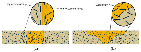 The greatest difficulties that the conventional welding methods traditionally used to join FRTP composites face are normally related to poor fibre distribution. Conventional methods present an inability to maintain the continuity of the fibres along the transition between base material and weld seam [45], where the reinforcement fibres are easily oriented parallel to the weld seam [51], as shown schematically in Figure 7a. According to Czigány and Kiss [45], the interruption of the reinforcement distribution means that the joint strength is generally limited by the strength of the matrix. On the other hand, because FSW involves the mixture of the material from the different parts, the fibre distribution is significantly improved, which allows a more homogeneous fibre interlacing along the joint, as illustrated in Figure 7b. This improvement of the fibres interlacing mechanism allows the production of welds with greater strength than the matrix [45], thus overcoming the limitations of other welding methods. Despite the fact that FSW allows a better distribution and orientation of the fibres than conventional welding methods, there is a lack of studies in the literature that address how the different welding parameters affect these aspects. The use of tracer materials is very interesting for a better understanding of the material flow, as it is already proven in the FSW of polymers [94] and metals [95,96,97]. Therefore, the use of tracer materials is highly recommended for the study of material flow in future works on FRTP composites.