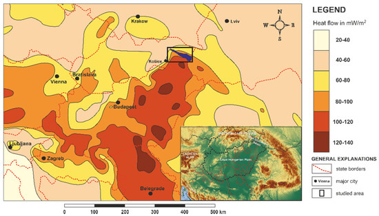 The Pannonian back-arc basin and its peripheral areas. The Eastern Slovak basin covers a significant part of Central Europe. The high heat flow (values in mW·m−2) distribution in the basin is not uniform. The same is true for the aquifers. The Humenné Unit (blue mark) is one of the aquifers for geothermal use (modified after [6,18]).