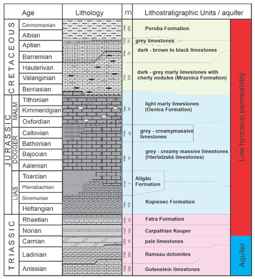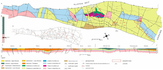 In the present, the unit is situated over the buried Iňačovo–Kričevo Unit and overlaid by Paleogene/Neogene sedimentary sequences and Neogene volcanics. The internal structure consists of Mesozoic sediments (Middle Triassic–Middle Cretaceous) which are represented as an eastward continuation of the Western Carpathians (Figure 2). Lithologically, the Middle Triassic limestones are characterized by intensive shallow-water carbonate sedimentation (Gutenstein limestones, Ramsau dolomites, and pale limestones) with thickness up to 250 m. The overlying Jurassic marly-sandy shales, shallow-water crinoidal limestones, and marly limestones are only partially represented. The Jurassic formations are conformably overlain by the Lower–Middle Cretaceous limestones with chert stone nodules and dark grey sandy limestones. The estimated thickness of the Cretaceous sediments is about 300 to 400 m. The Humenné Unit is overlain by transgressive Paleogene sedimentary sequences such as conglomerates and breccias as well as Neogene volcanic sedimentary complexes (where andesites and marls dominate).